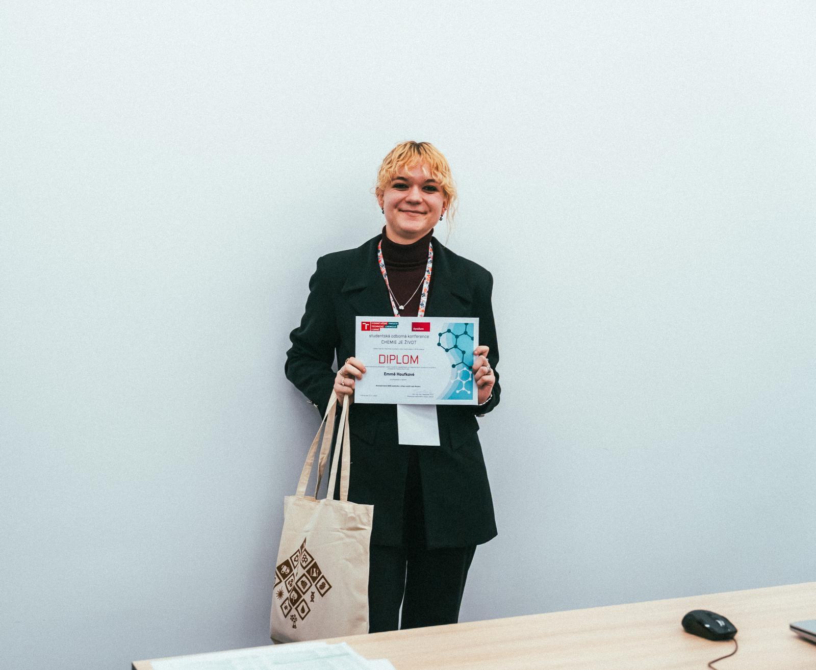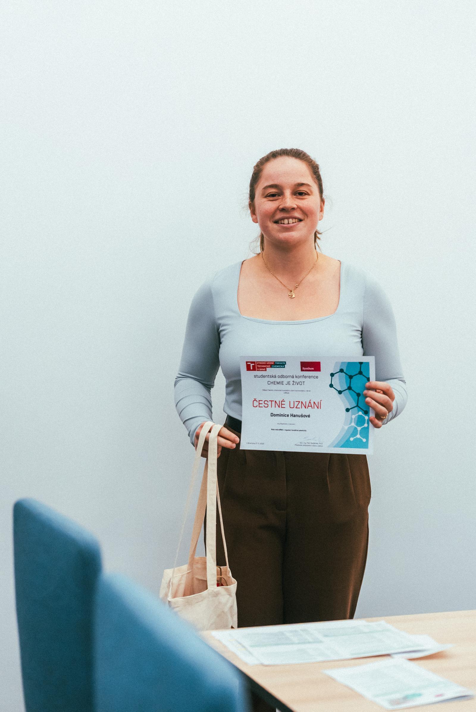 - Čestné uznání obdržela Eva Jazmína Tomečková za příspěvek Studium derivátů flavinu pro využití v ekologických bateriích.