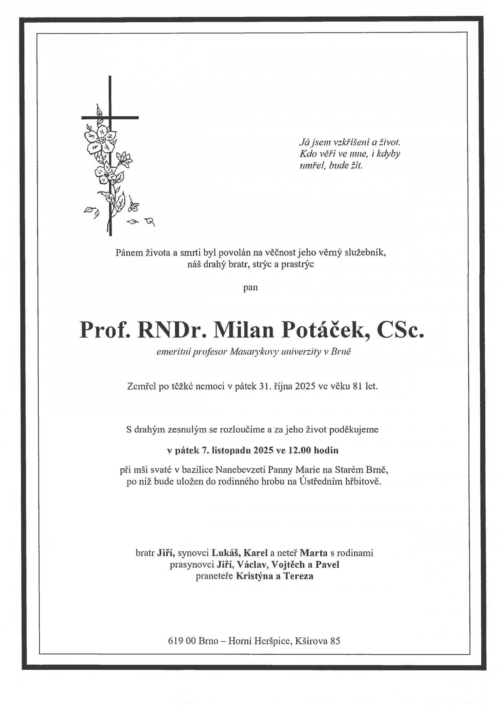 Zemřel prof. RNDr. Milan Potáček, CSc.
