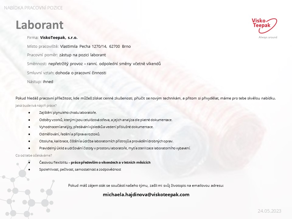 Společnost ViskoTeepak s.r.o. nabízí pozici Laborant. Další informace najdete v příloze.| Publikováno | |