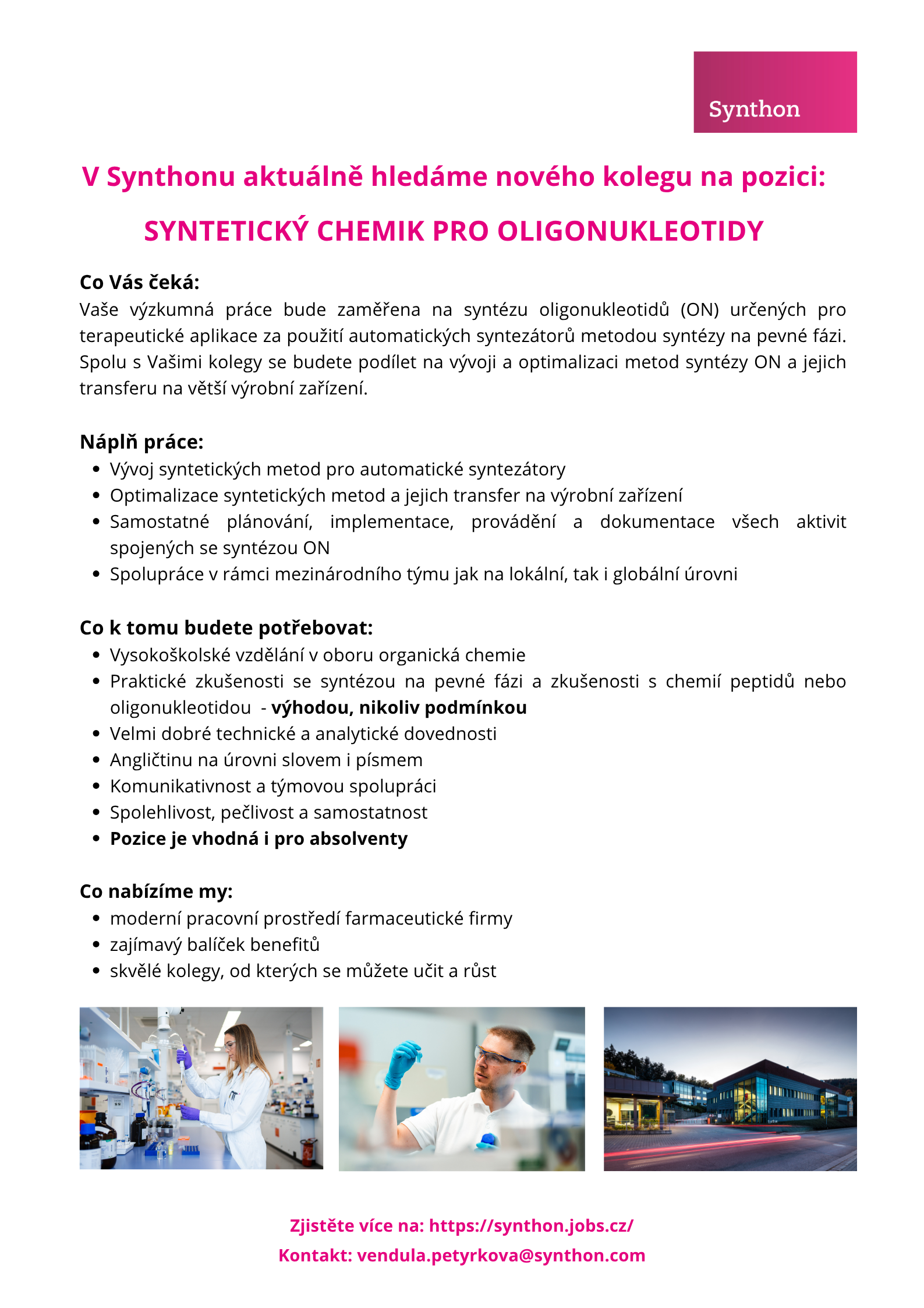 Společnost Synthon hledá nového kolegu na pozici Syntetický chemik pro oligonukleotidy. Více informací v příloženém letáku.